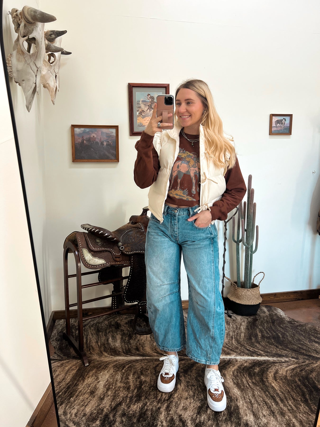 Model shown wearing her normal size small in the vest with a crewneck layered underneath